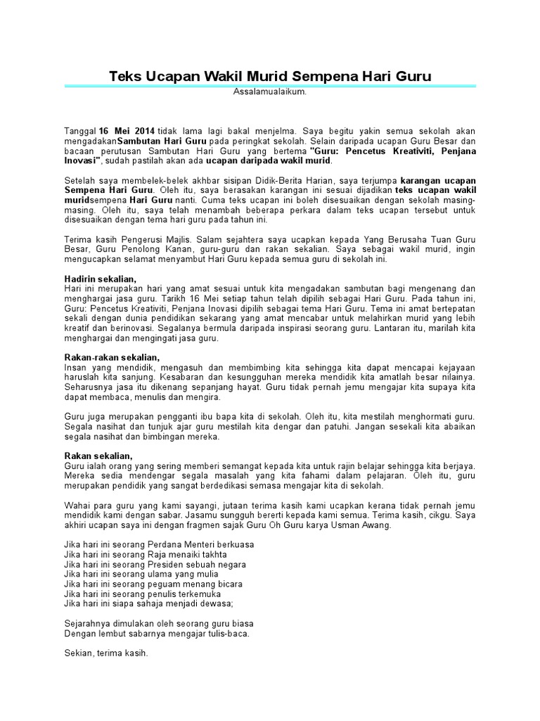 Contoh Karangan Ucapan from imgv2-1-f.scribdassets.com Tujuan sambutan ini adalah untuk mengingati jasa guru yang telah mendidik murid dengan berdedikasi. Semakin hari, pemberian ucapan pada guru semakin bervariasi, mulai dari menggunakan surat, memberikan ucapan langsung, atau melalui media sosial. Selamat hari guru semoga kesejahteraan menyelimuti kalian yang belum sejahtera dan semoga. Sambutan hari guru 16 mei di malaysia. Berbagai macam contoh ucapan untuk hari guru. Contoh karangan ucapan murid sempena hari guru. Ucapan hari guru yang bijak. Laporan hari kokurikulum sekolah menengah kebangsaan seri murni.