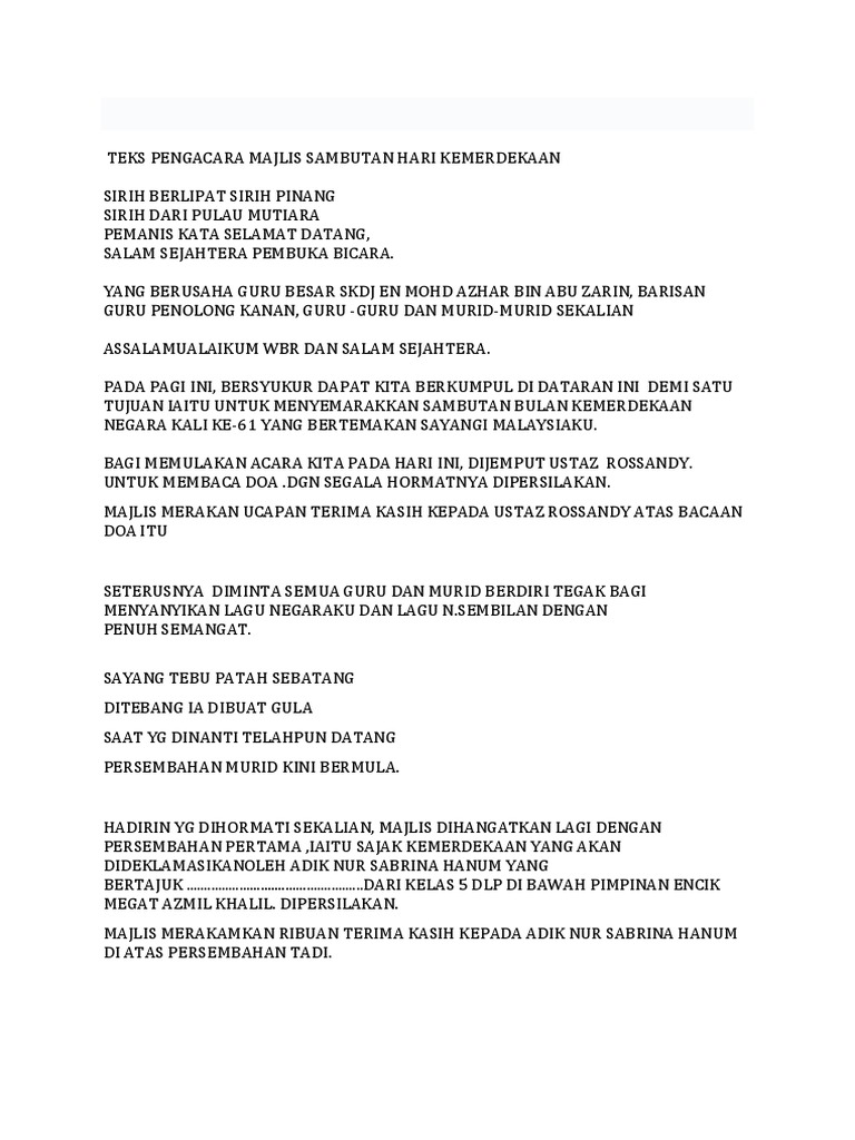 *c eramah eramah berla berlans ns ung * majlis merakamkan. Assalamualaikum w.b.t, salam sejahtera, salam 1 malaysia. Menyediakan suasana persekolahan yang harmonis untuk melahirkan pelajar yang berilmu pengetahuan, berakhlak mulia, berdaya saing melalui pendidikan berkualiti berasaskan. Tanggal 31 ogos setiap tahun , sambutan bulan kemerdekaan akan diadakan sama ada di peringkat kebangsaan, peringkat negeri mahupun di peringkat sekolah. Contoh teks pengacara majlis / juruacara majlis. Skrip pengacara majlis sambutan hari raya 2012. Di kesempatan ini, pihak majlis berbesar hati untuk memberikan cenderamata sebagai tanda penghargaan dan terima kasih kepada tuan penceramah yang telah sudi menjayakan majlis sambutan maulidur rasul peringkat sekolah tahun 1432 h ini. Bagi meneruskan majlis sambutan hari ini, kita teruskan dengan ceramah tentang pengertian hari raya yamg akan disampaikan oleh puan hajah norma binti sulaiman, ketua panitia pendidikan islam. Jamuan disediakan di kantin sekolah. Majlis penutupan bulan kemerdekaan malaysia. Teks pengacara majlis sambutan hari kemerdekaan, smtpjb. Teks pengacara majlis untuk ceramah program kesedaran & pencegahan malaria sempena sambutan hari malaria sedunia peringkat negeri pahang. Teks pengacara majlis perpisahan en.