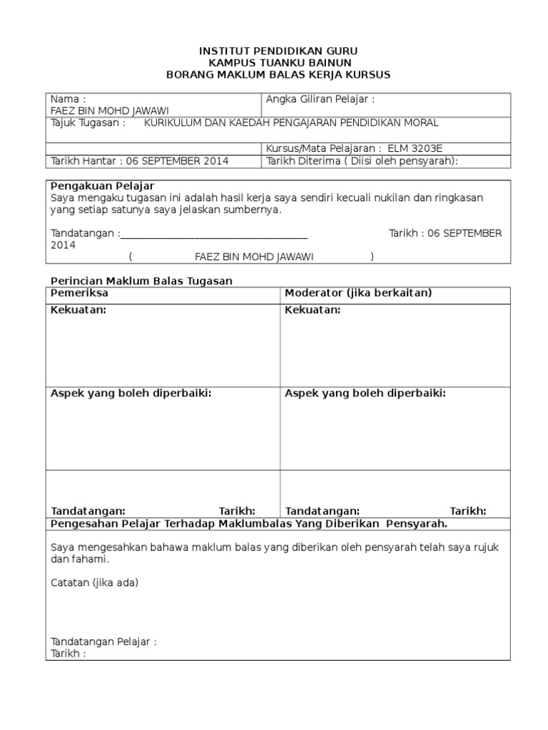 Senarai semak fail kursus pensyarah universiti malaysia sabah. Savesave borang maklum balas kerja kursus for later. Laporan borang maklum balas kursus ums/pk07/student feedback form. Jalan maktab perguruan islam, sungai merab, 43000 kajang, selangor darul ehsan, malaysia. Borang maklum balas kerja kursus.