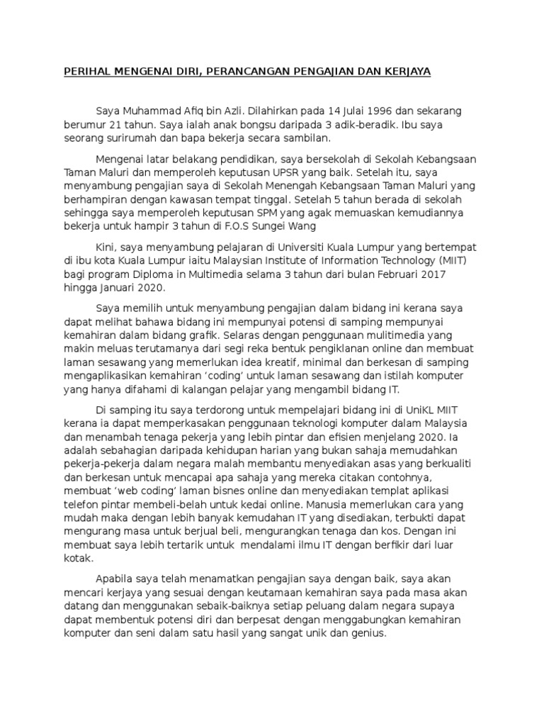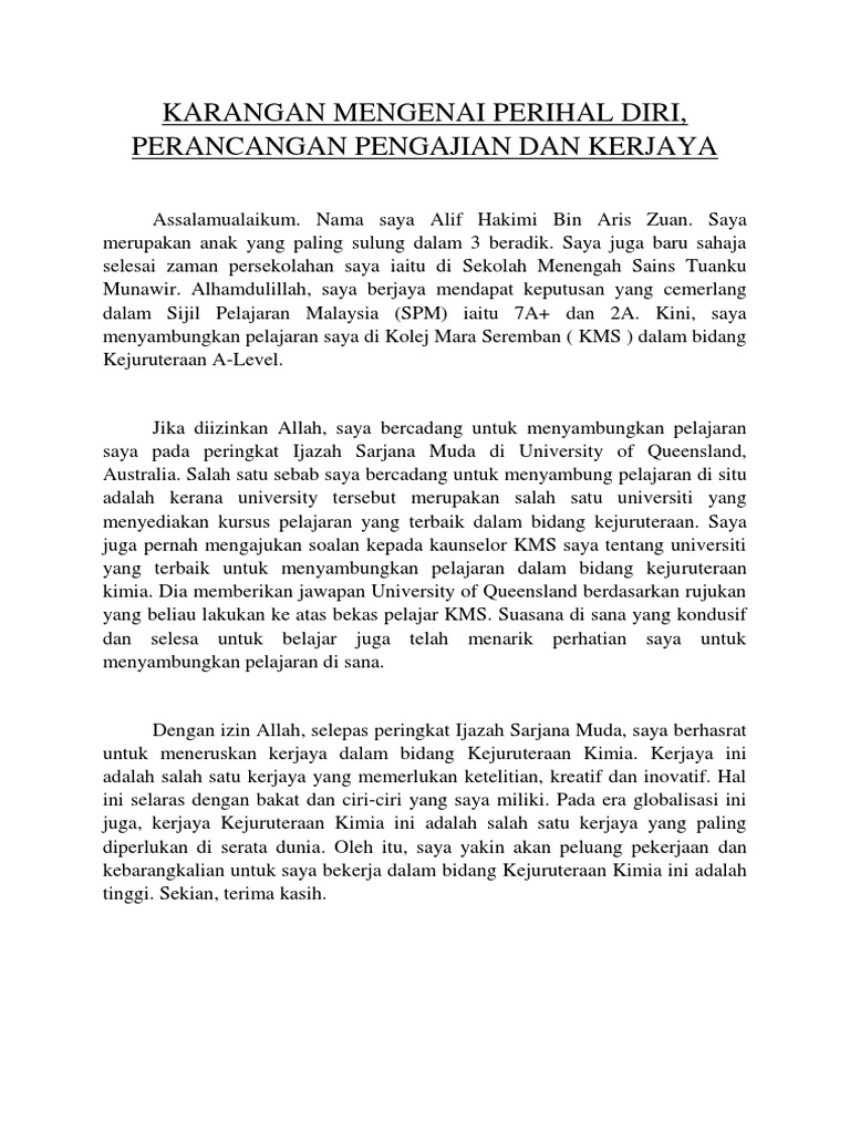 Contoh Contoh Karangan Flip Ebook Pages 1 24 Anyflip Anyflip from online.anyflip.com Saya menetap di sebuah kawasan yang agak terkenal di tanah air iaitu banting di selangor. Boleh masuk asasi dulu, then pointer cantik boleh terus apply mara untuk sambung ke luar. Karangan mengenai perihal diri, perancangan pengajian dan kerjaya. Contoh karangan perihal diri perancangan dan kerjaya mp3 & mp4. Apa sih karangan narasi itu? Saya merupakan anak tunggal dan dibesarkan dalam keluarga yang sederhana. Diri saya nama saya muhammad nu'aim bin abdul kadir. Saya lahir pada 31 oktober 1993 di hospital besar ipoh, perak.